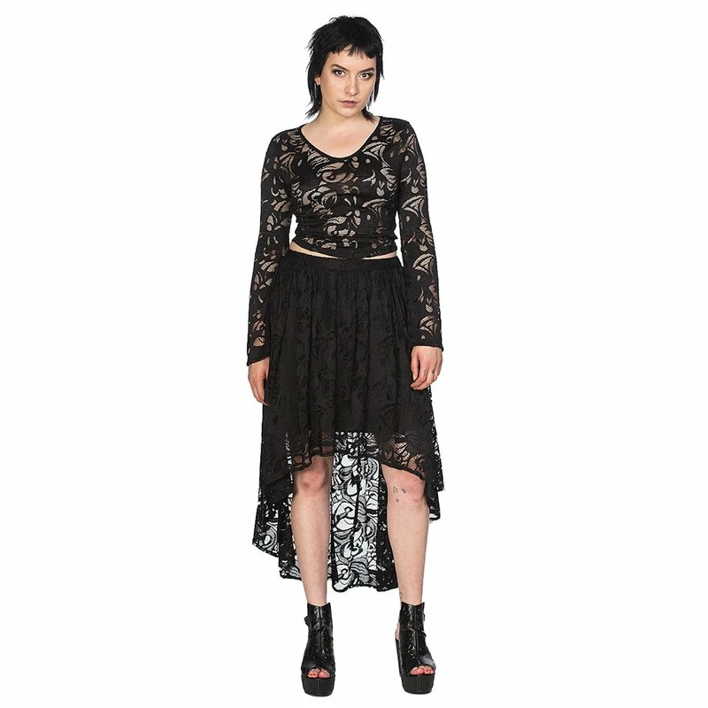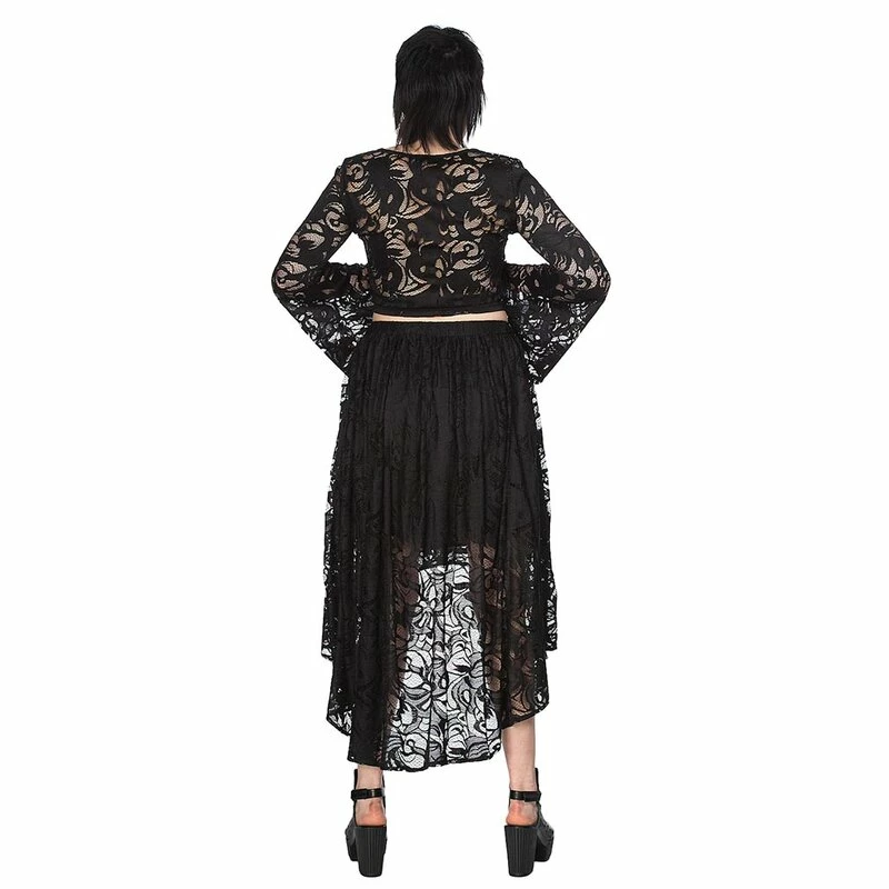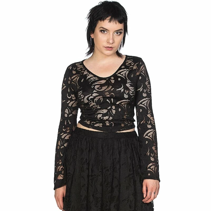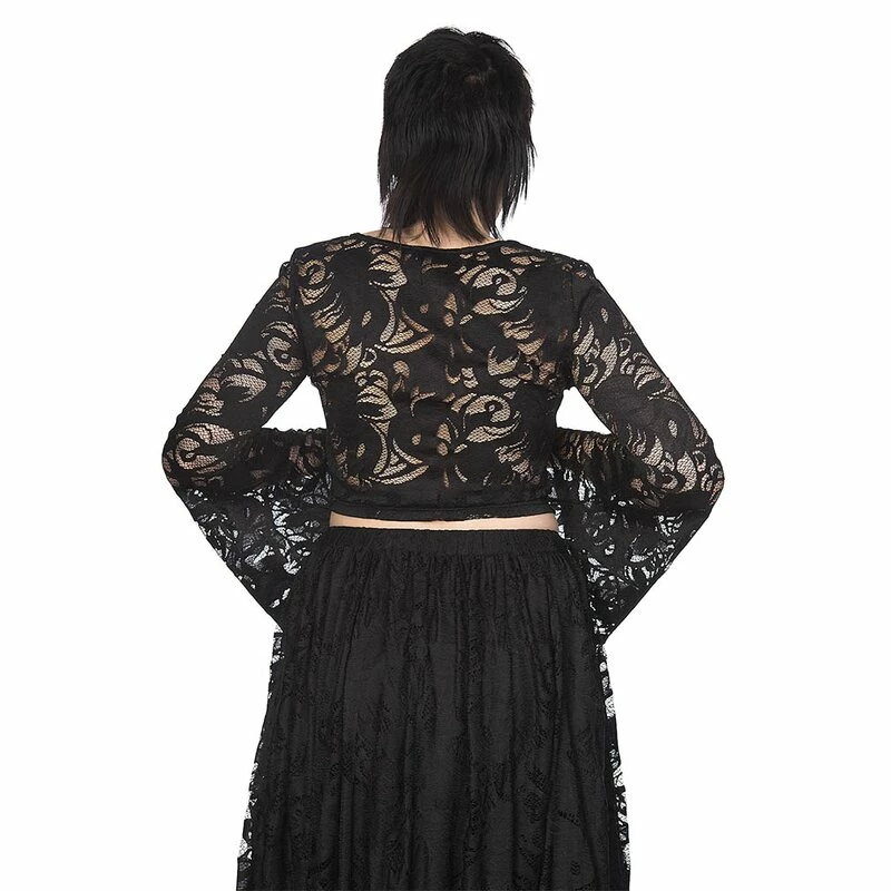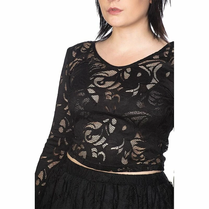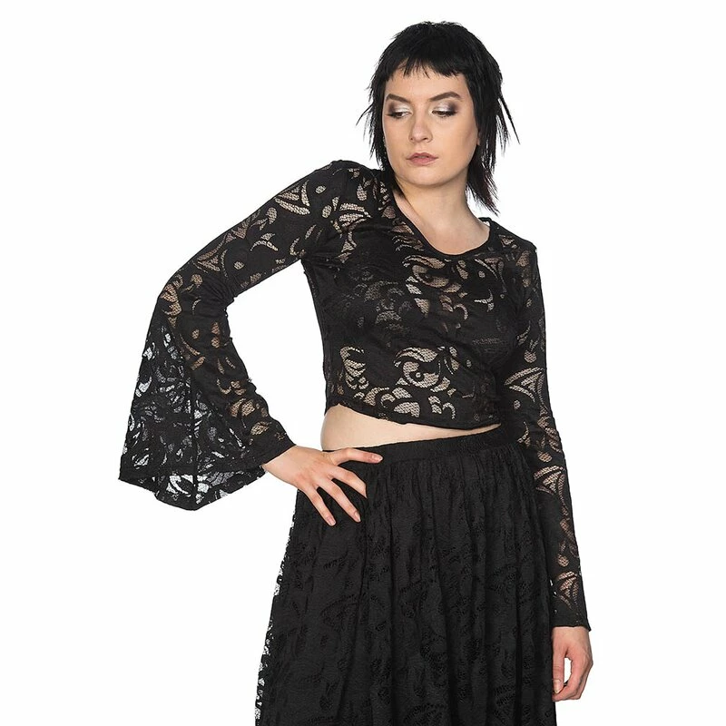 Gothic Crop Top mit Retro Touch von Banned Alternative. Das Wide 70s Oberteil ist aus feiner Spitze mit floralem Muster. Das Top ist bauchfrei geschnitten, mit extra weiten Glockenärmeln.