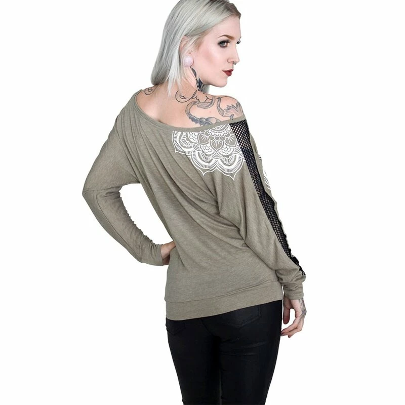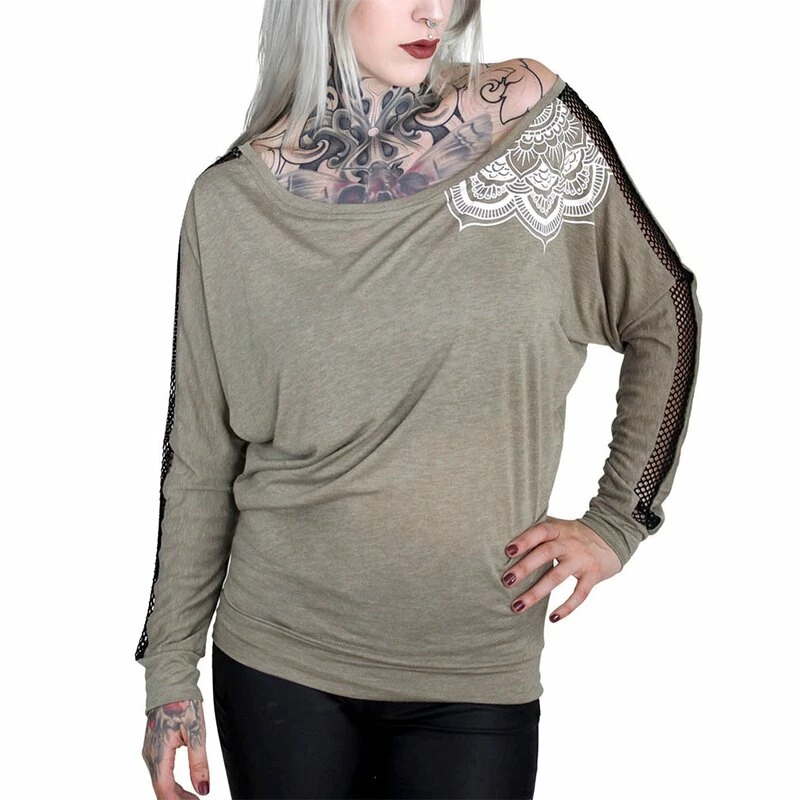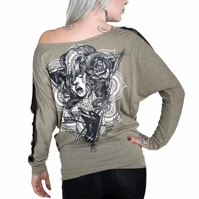 Cooles olivfarbenes Top von Hyraw. Das Prophecy Shirt ist umdrehbar, mit keiner Vorder- oder Rückseite. Also, kannst du es immer so rum tragen, wie es gerade zum Anlass passt. Auf einer Seite hat das Oberteil einen Print einer dämonischen Wahrsagerin. Auf der anderen Seite befindet sich in einer Ecke ein dekoratives Mandala.
