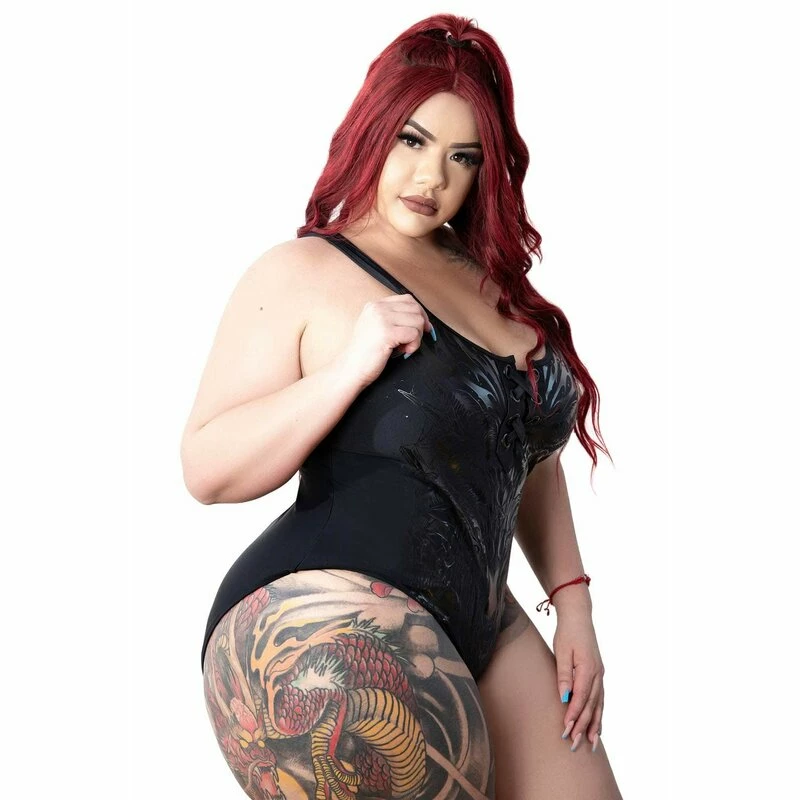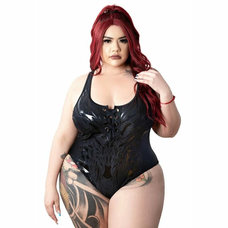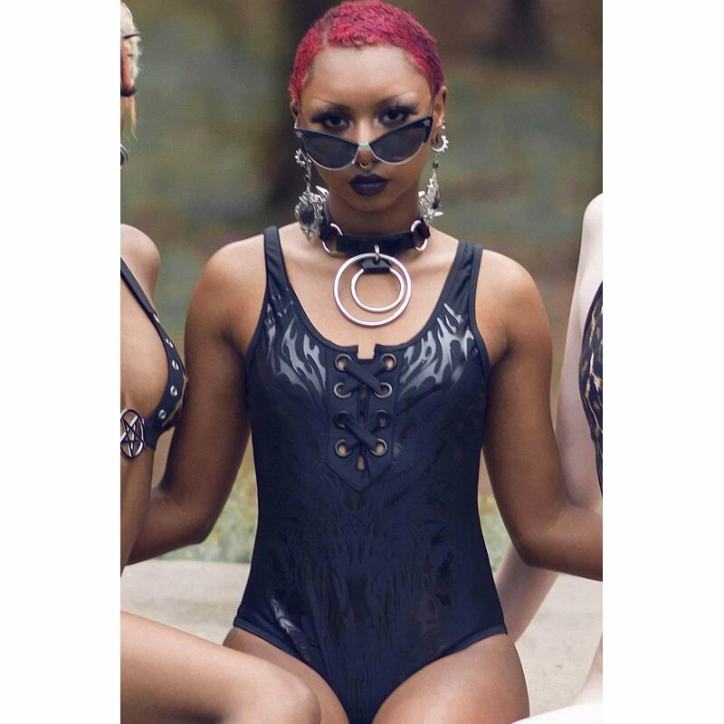 Ich schwimme einfach von der Negativität weg. Tschö! Killstars Depths Of Hell Badeanzug hat einen glänzenden Baphomet Print und eine Schnürung an der Vorderseite.