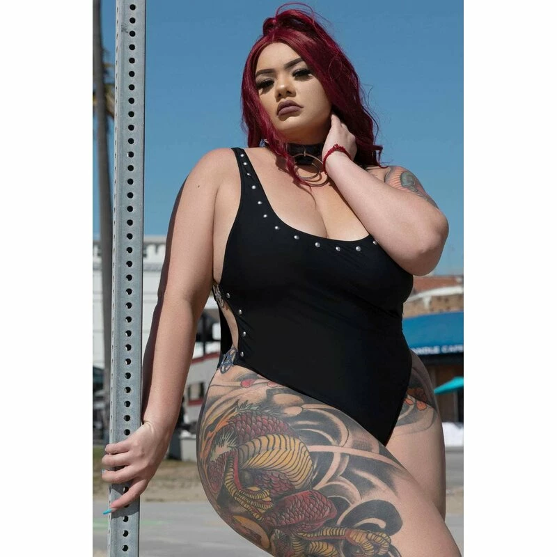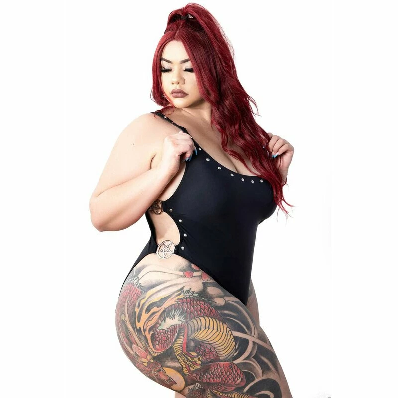 Heißer als die Hölle. Killstars Lilith ist der ultimative Goth Badeanzug. Er ist aus extra weichem, pechschwarzem Nylon, und mit Nieten und metallenen Pentagrammen verziert.