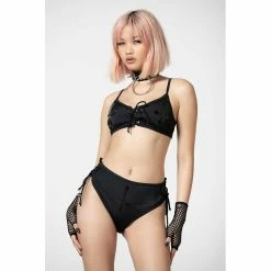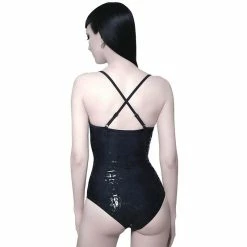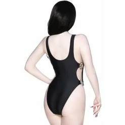 Heißer als die Hölle. Killstars Wendy ist ein schwarzer Badeanzug mit großen Cut-Outs an der Vorderseite und den Seiten, welche durch elastische Riemen und metallene Ringe verbunden sind.