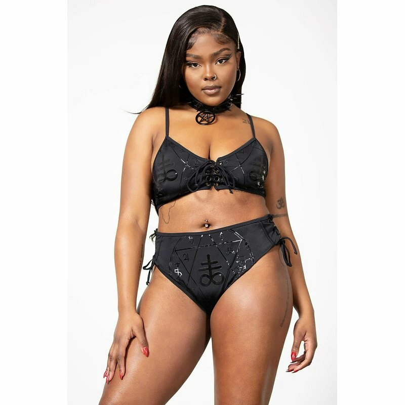 Heißer als die Hölle! Killstars Xandria Bikini hat glänzende schwarz-auf-schwarz Prints von Leviathankreuzen. Sowohol am Oberteil und am Höschen hat er Schnürungen.
