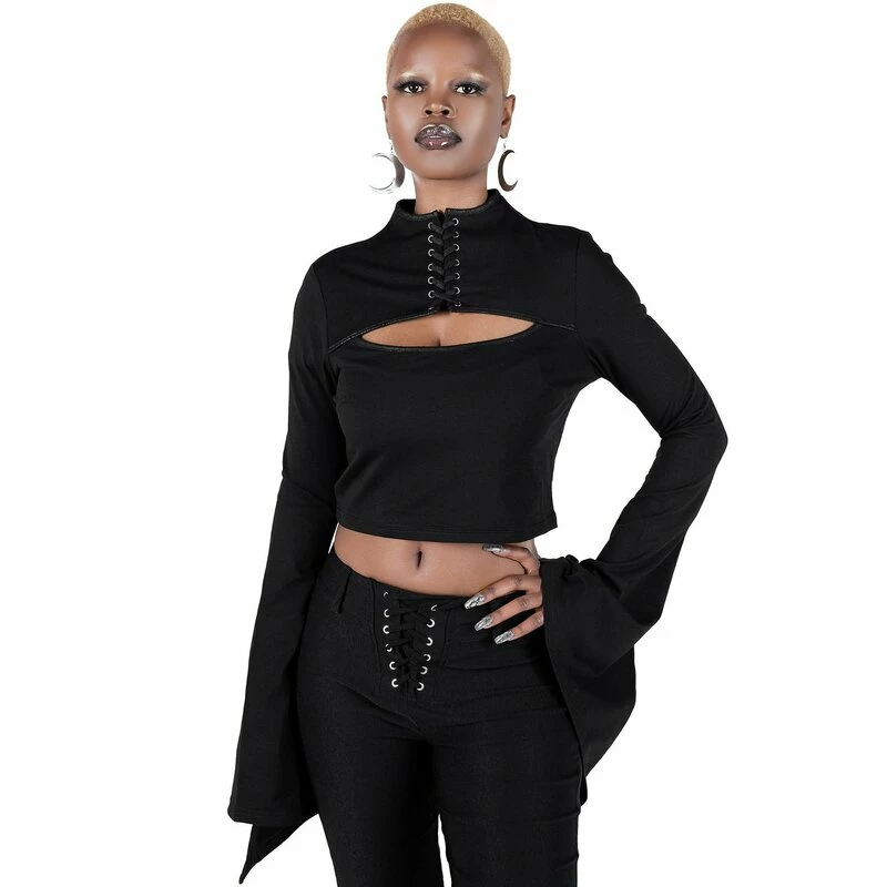Ich werde am Ende der Zeit auf dich warten. Killstars Demon Darling ist ein extra weicher Crop Top mit dramatischen Glockenärmeln. An der Vorderseite hat er einen Cut-Out und eine Schnürung, mit Kunstlederpaspelierung.