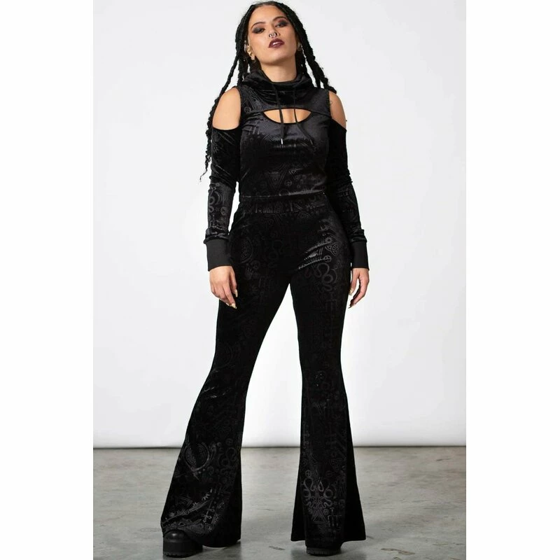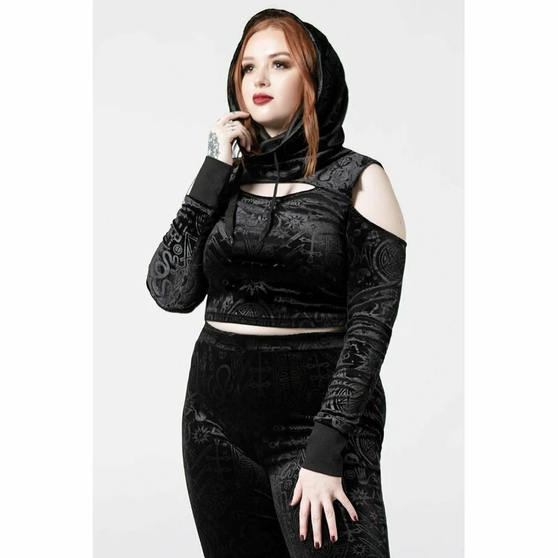 Gute Mädchen sind einfach nur böse Mädchen, die noch nicht erwischt wurden! Killstars Lowkey Kapuzentop ist bauchfrei und aus weichem Samt, mit einem geprägten Muster von okkulter Symbolik.