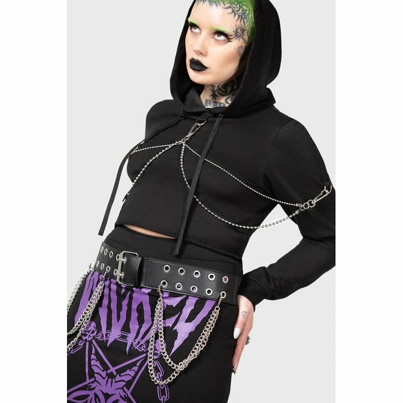 Killstars Wicked Crew Crop Top ist aus weicher Baumwolle mit einer weiten Kapuze. An der Vorderseite befinden sich abnehmbare, dekorative Ketten.