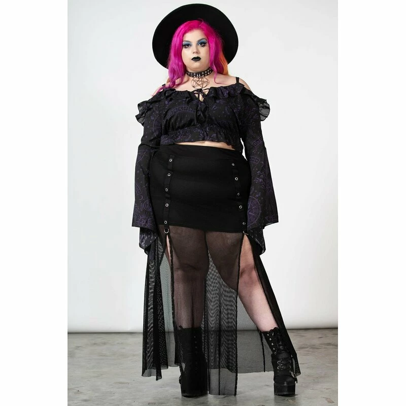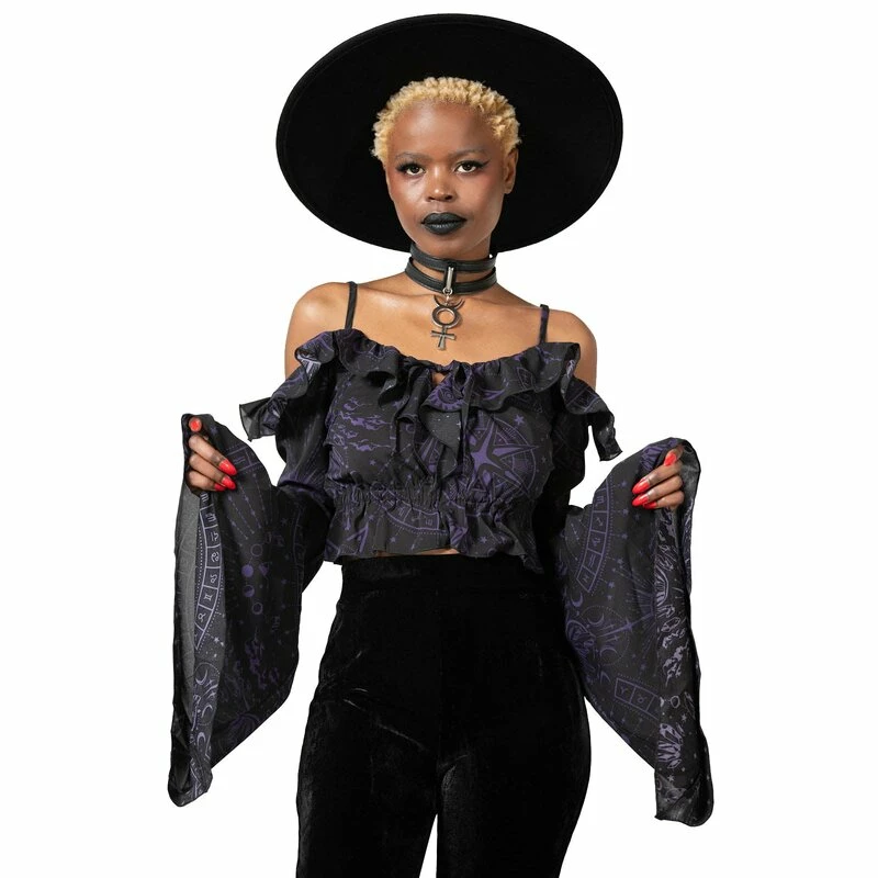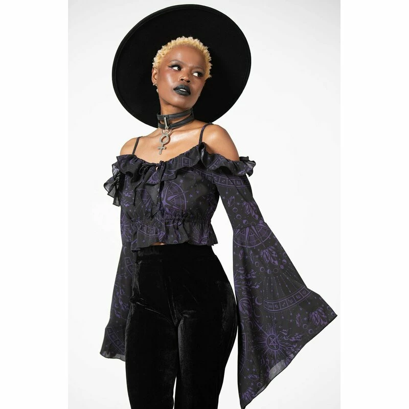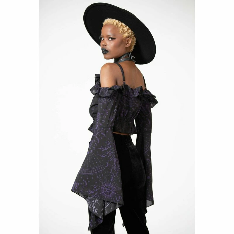 Killstars Spirit Hand Crop Top hat gerüschte Säume und extra weite Glockenärmel. Es hat einen kosmischen all-over Print. Das lilafarbene Muster hat galaktische Symbole wie Sterne, Monde, Sonnen und Tierkreiszeichen, sowie okkulte Zeichen wie Pentagramme, Kristalle und All-sehende Augen.