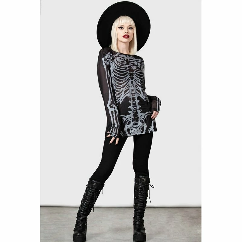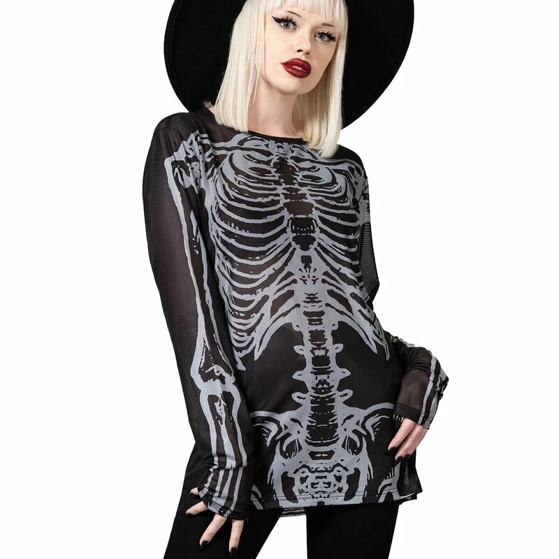 Killstars Scapula Top besteht aus feinem Mesh Material mit einem grauen Skelett Print an der Vorderseite und auf den Ärmeln.