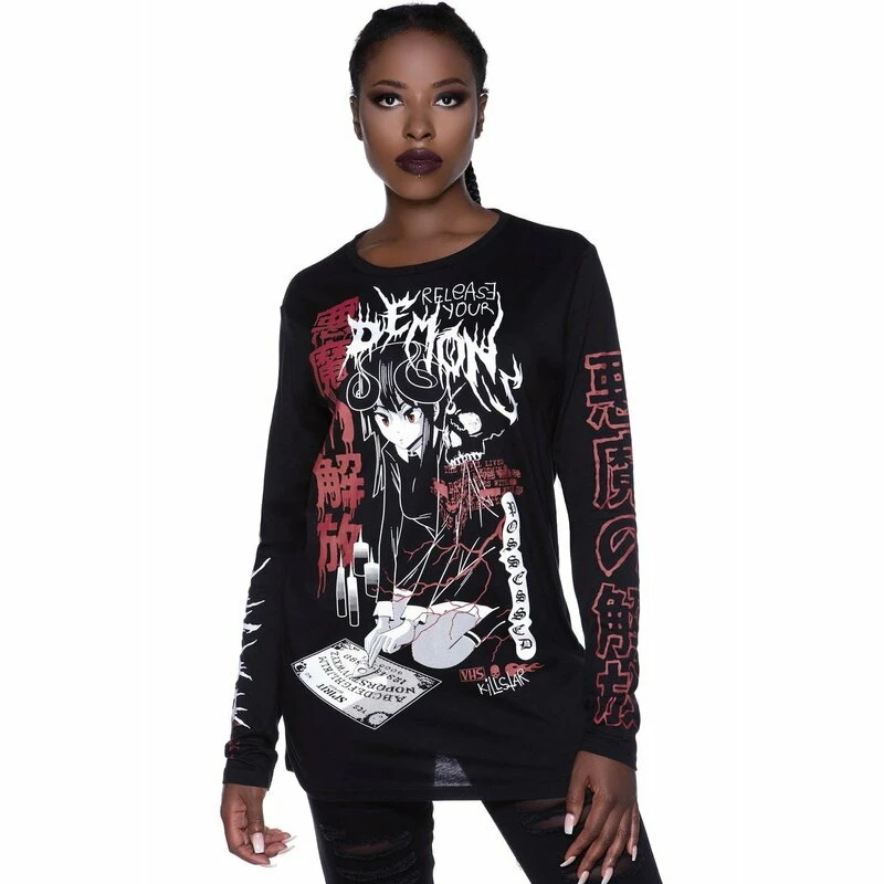 Befreie deine inneren Dämonen. Es ist eine Welt voll Macht und Kraft, die du noch nie zuvor erlebt hast. Killstars Release Me Print zeigt eine düstere Hexe, im Manga Style, bei einem Beschwörungsritual. Der japanische Schriftzug bedeutet übersetzt „Release of the Devil“.