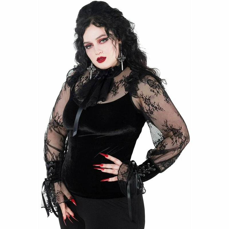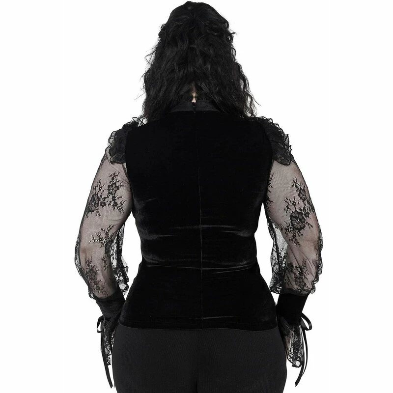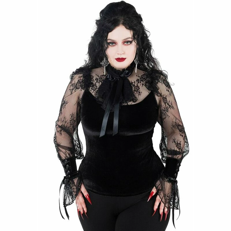 Ich bin sowhol das Höllenfeuer, als auch das Weihwasser. Welches du abbekommst hängt davon ab, wie du mich behandelst. Killstars Amber Oberteil ist aus extra weichem Samt mit Schultern und Ärmeln aus edler Spitze. Am Ausschnitt befinden sich ein gerüschte Jabot und eine Satinschleife. Kleine Schnürungen befinden sich an den Manschetten.