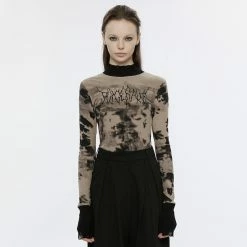 Killstars Andrazzi Oberteil hat ein graues Grungemuster mit Klecksen, Kritzeleien und Graffiti. Es ist flächendecken zerschlitzt, zerrissen und zerlocht.