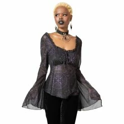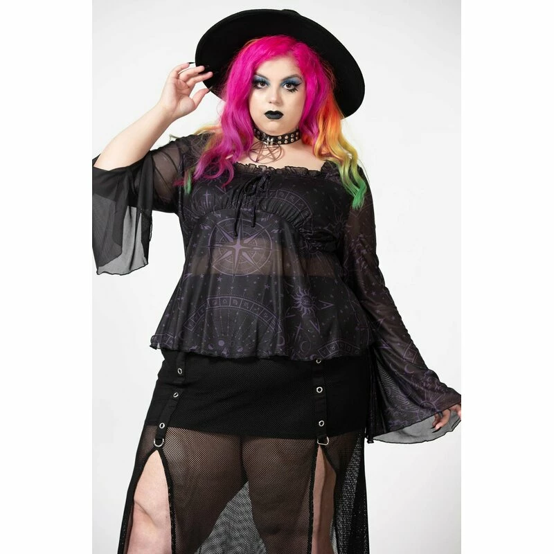 Killstars Astromancy Oberteil ist aus durchsichtigem Mesh mit extra langen Glockenärmeln. Es hat einen kosmischen all-over Print. Das lilafarbene Muster hat galaktische Symbole wie Sterne, Monde, Sonnen und Tierkreiszeichen, sowie okkulte Zeichen wie Pentagramme, Kristalle und All-sehende Augen.