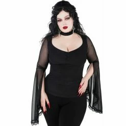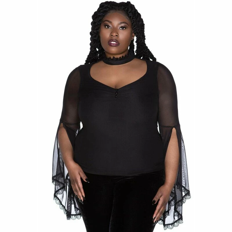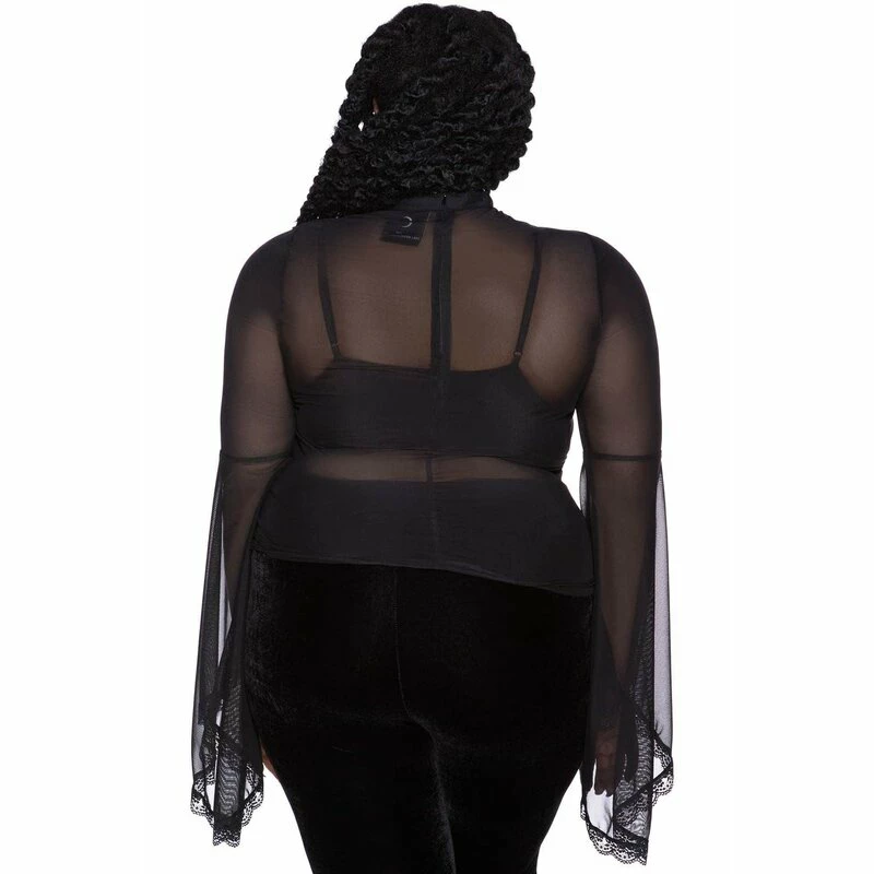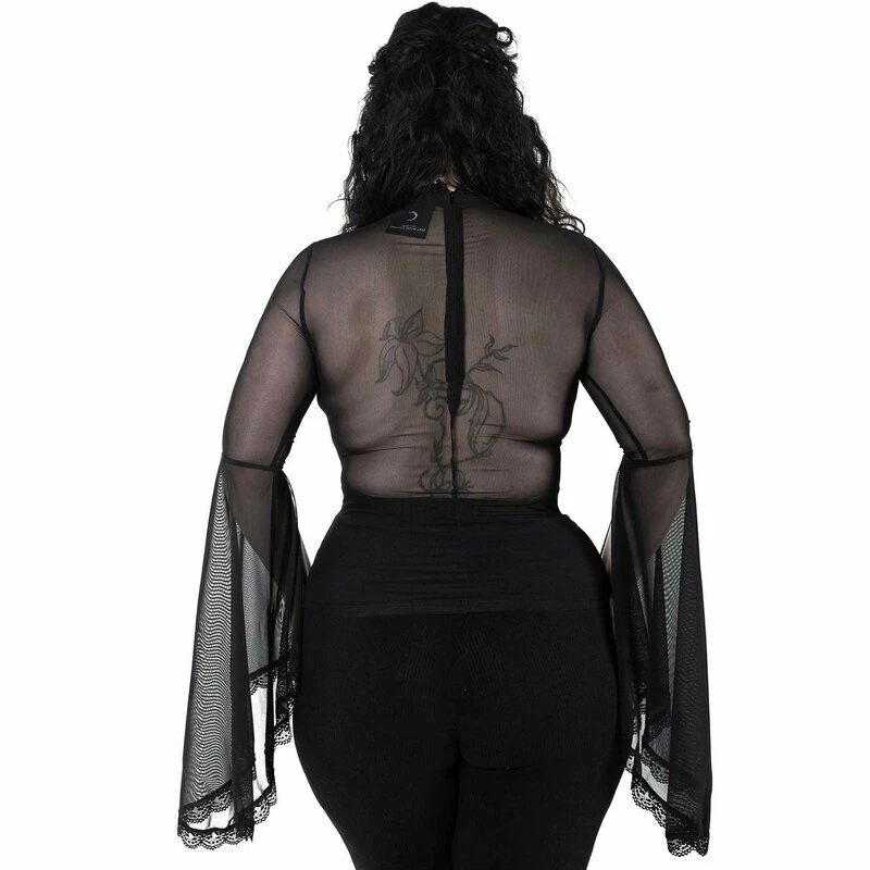 Ich bin sowhol das Höllenfeuer, als auch das Weihwasser. Welches du abbekommst hängt davon ab, wie du mich behandelst. Killstars Bloodfeast Oberteil ist ein luxuriöser Top für die Vampirin von heute. Es ist aus durchsichtigem Mesh, mit einem blickdichtem Futter an der Vorderseite. Die Ärmel sind bis zu den Ellbogen geschlitzt und haben, sowie der Choker-Ausschnitt, Bordüre aus feiner Spitze.