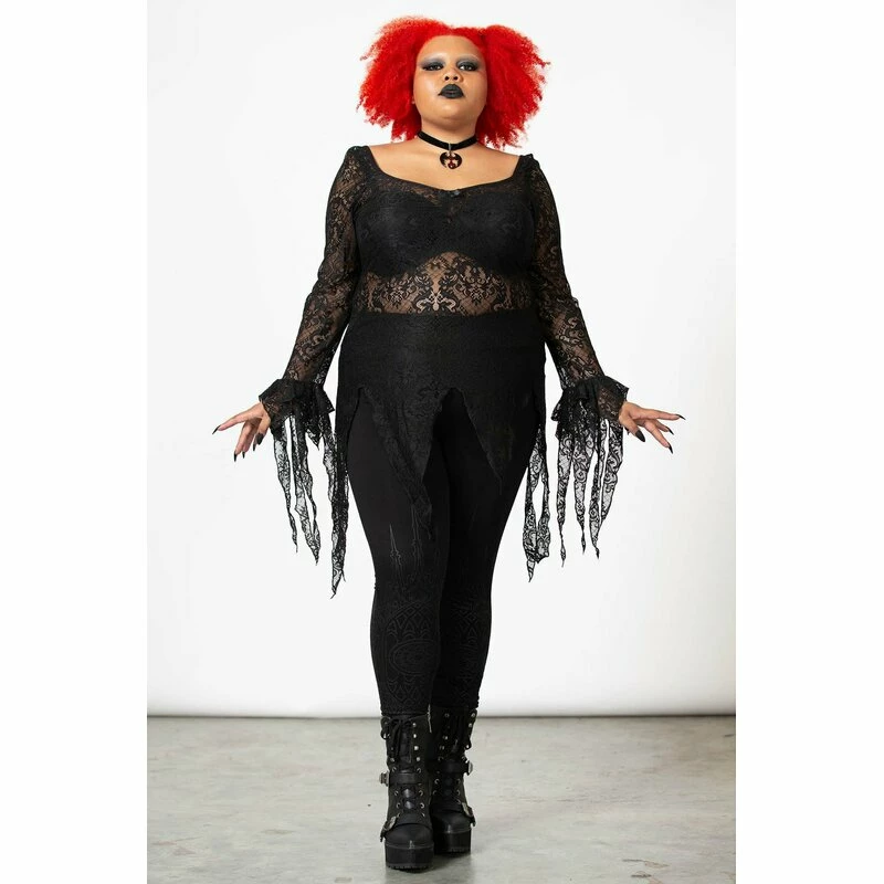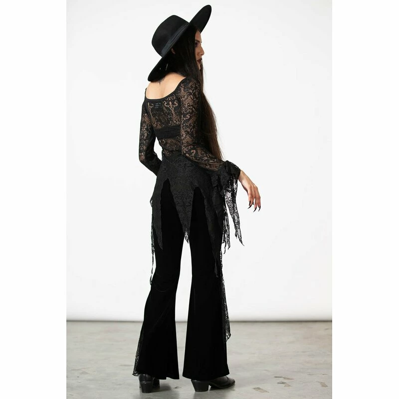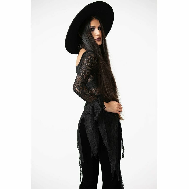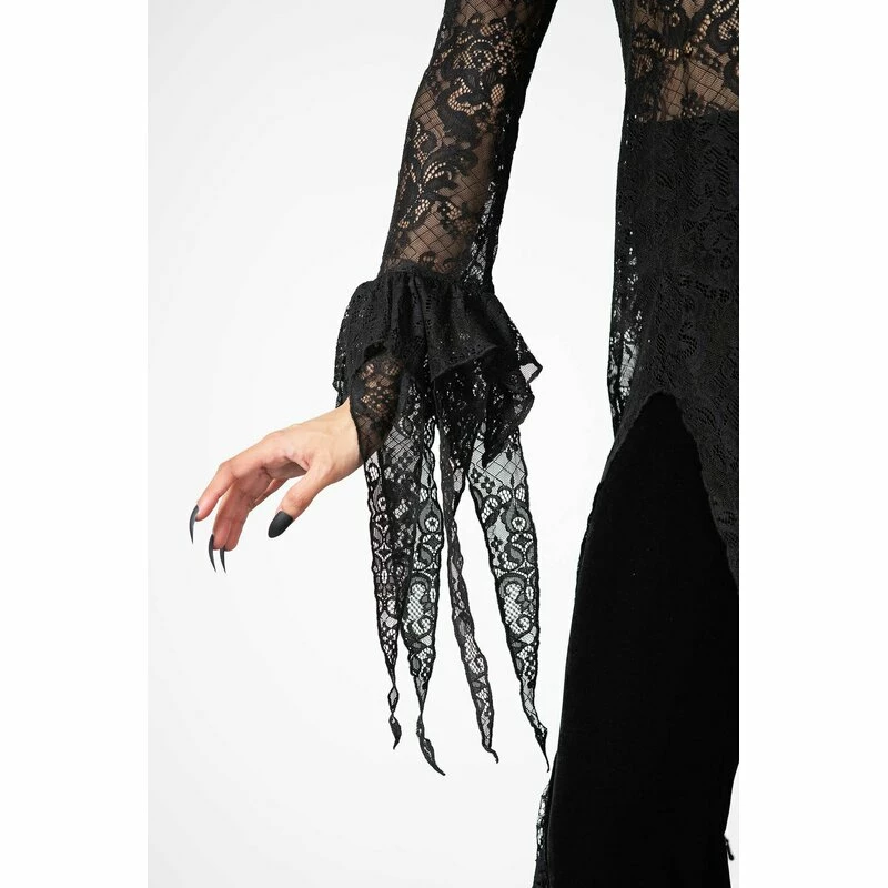 Killstars Faythe Top ist aus feiner Spitze mit einem Blumenmuster. Er hat einen langen Zipfelsaum. Die Ärmel haben ähnliche zipfelförmige Verlängerungen an den Manschetten.