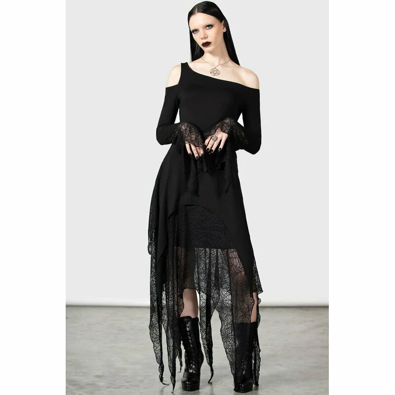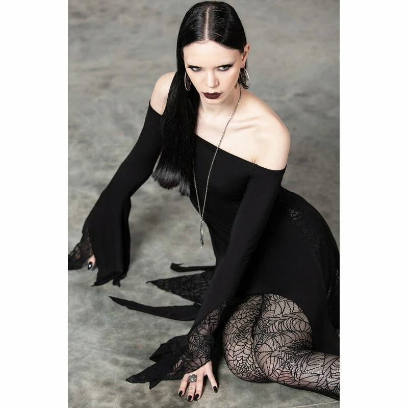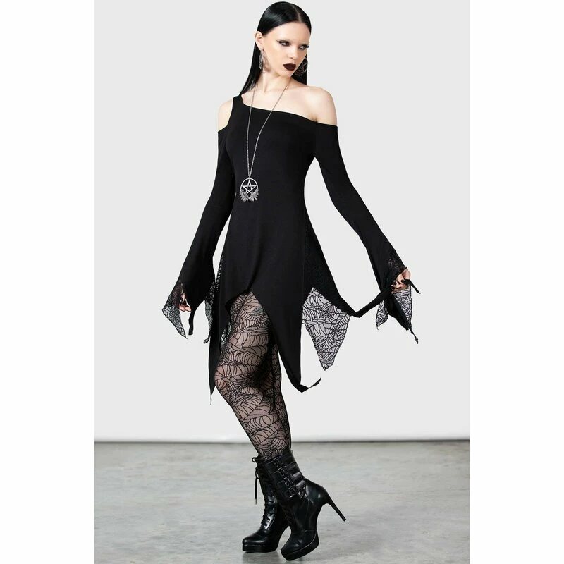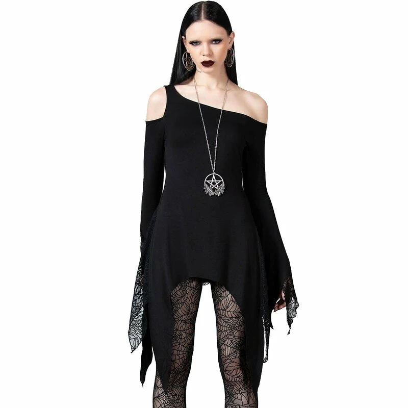 Killstars Night Snare Oberteil ist ein extra langer Top mit Zipfelsaum. Am Saum und den Manschetten befinden sich Erweiterungen aus feiner Spitze mit einem Muster von Spinnennetzen.