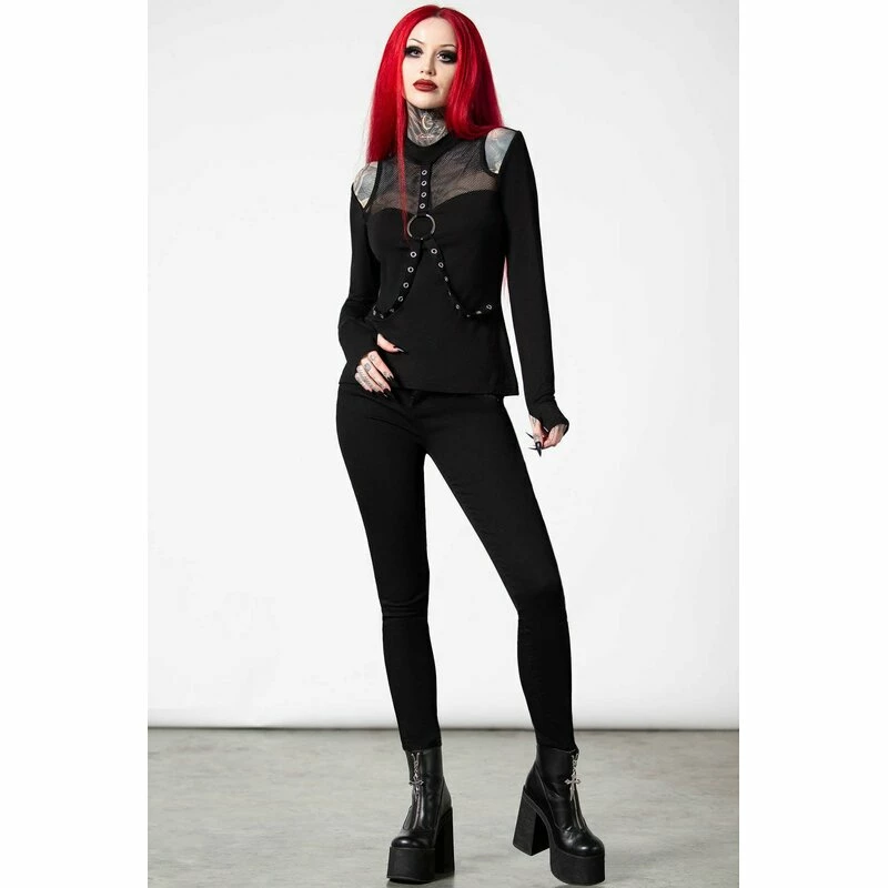 Inspiriert durch die Angst 08/15 zu sein. Killstars Pogo Oberteil hat über der Brust einen Einsatz aus feinem Mesh Netz. Unterhalb diesem befindet sich ein großer, metallener O-Ring und dekorative Riemen.
