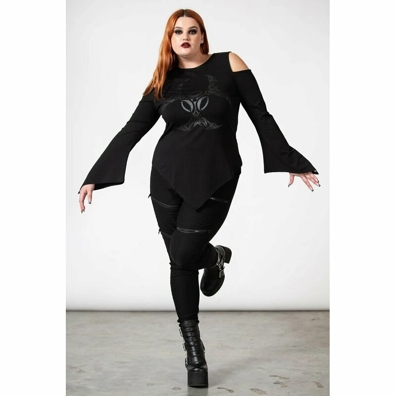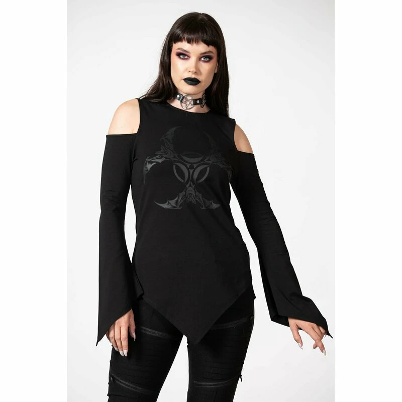 Killstars Voxy Top ist aus weicher Baumwolle. Er hat an der Vorderseite einen schwarz-auf-schwarz Gefahrensymbol Print. Das Gefahrensymbol besteht aus drei Fledermäusen.