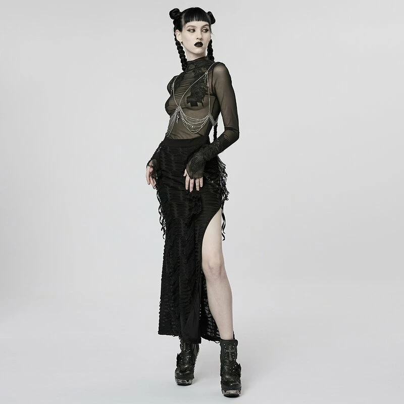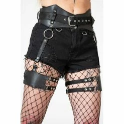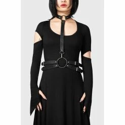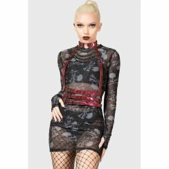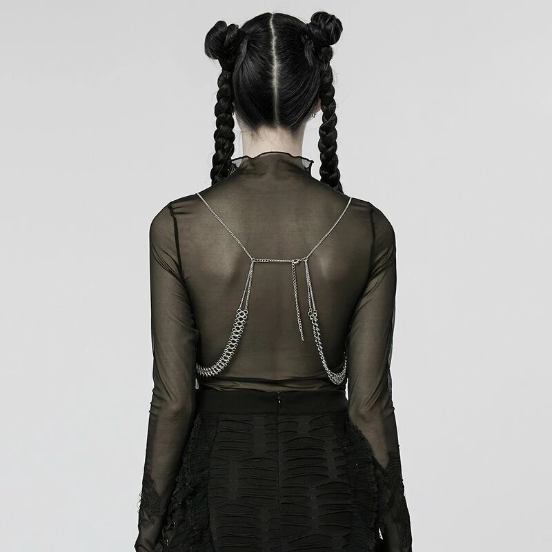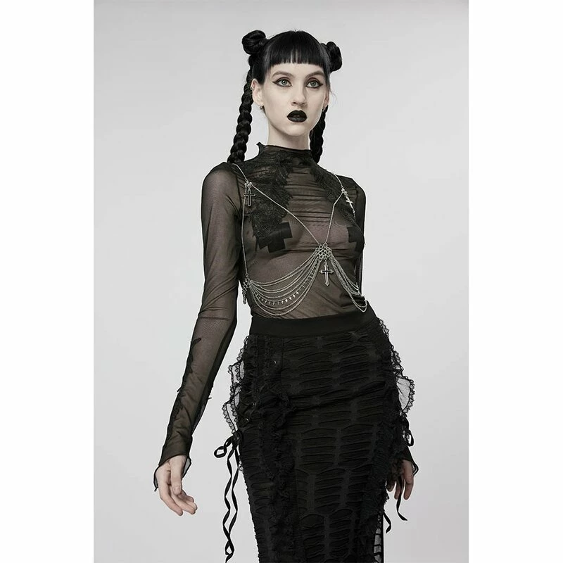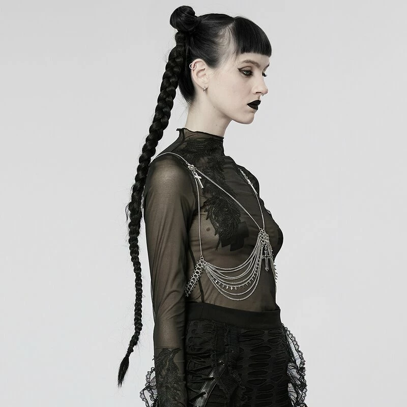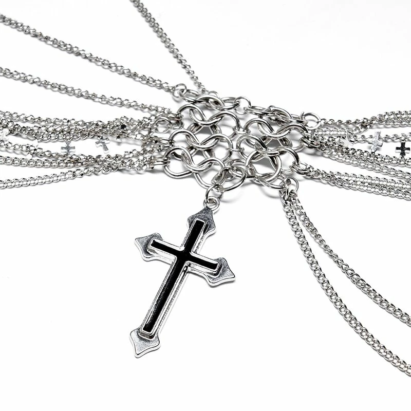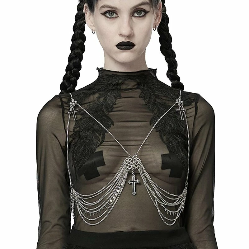 Punk Raves Cross My Heart Harness besteht aus vielen verschiedenen Ketten, welche die Brust umrahmen. An den Schultern und der Mitte befinden sich drei große Kruzifixe. Kleine Kreuze verzieren ein paar der Ketten.