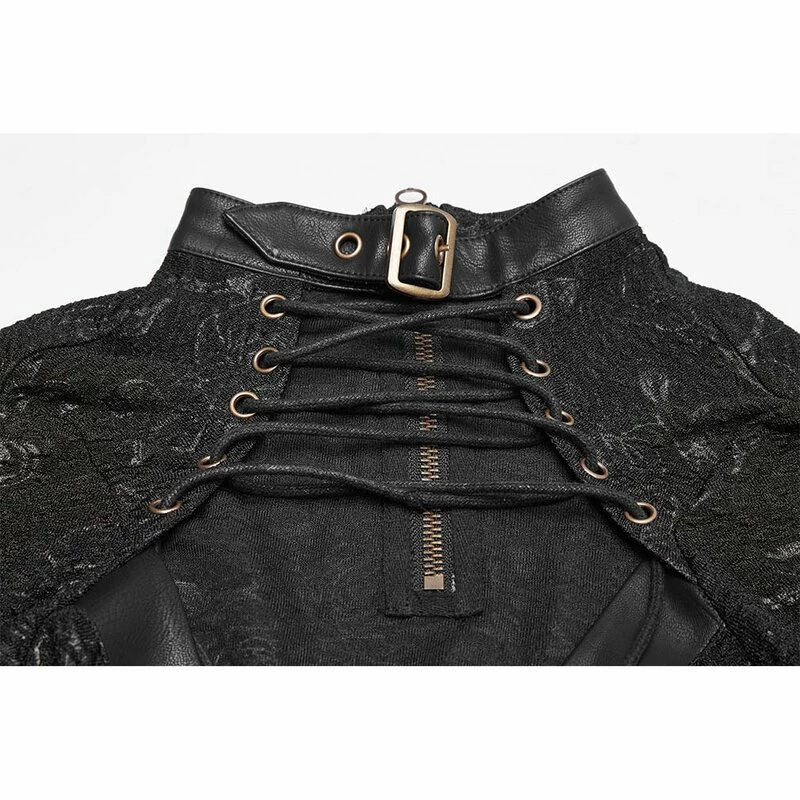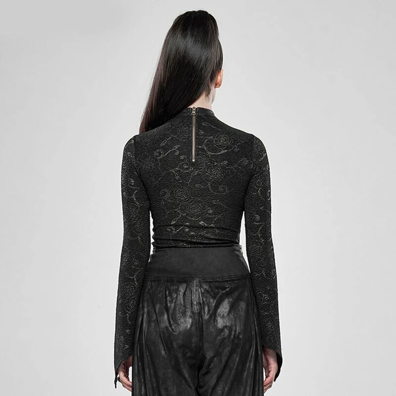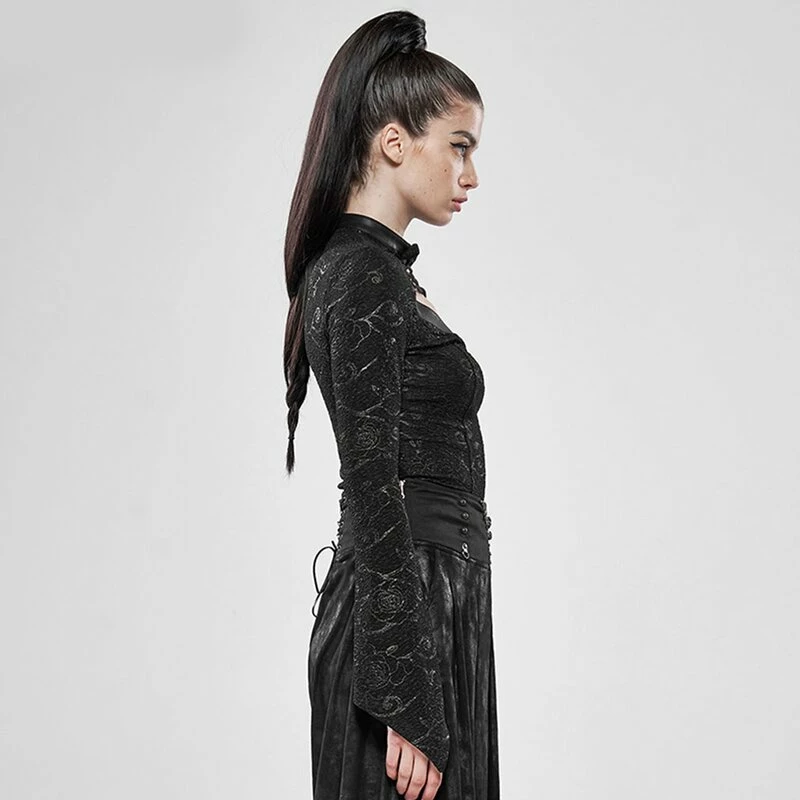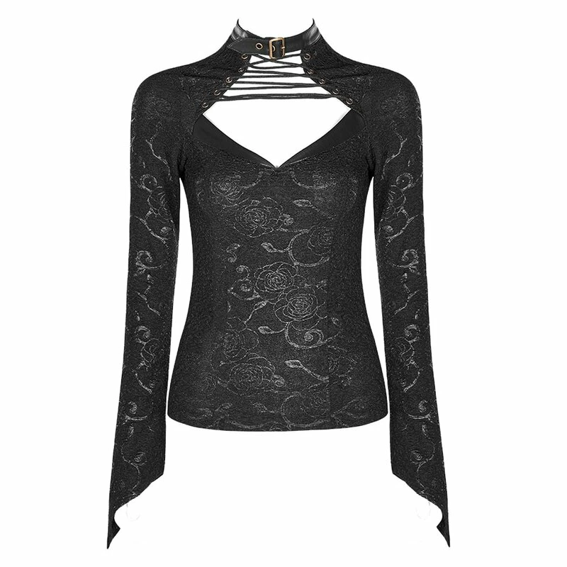 Schwarz-auf-schwarz must-have Basic von Punk Rave. Das Doomed Rose Oberteil ist hat einen extra großen Schlüsselloch, über welchem eine Schnürung und eine Kunstlederschnalle sind. Das Top hat ein all-over Rosenmuster.