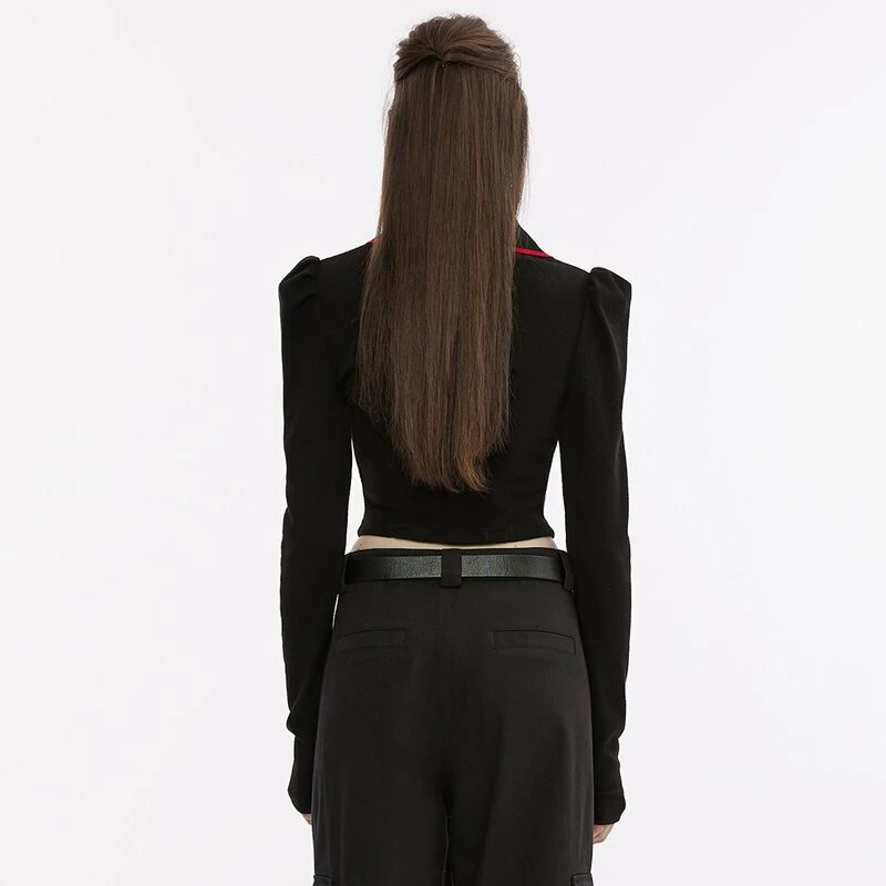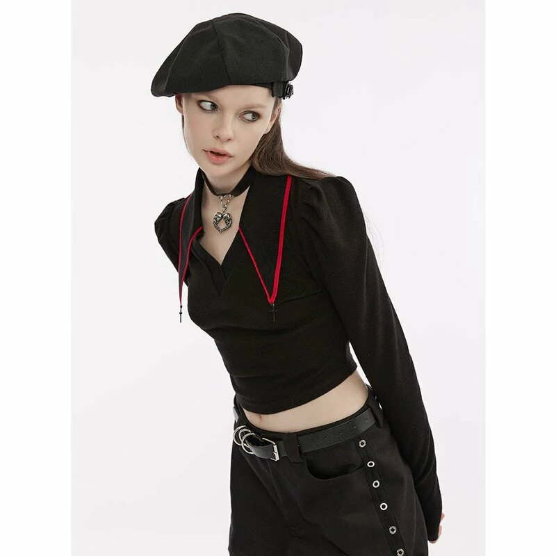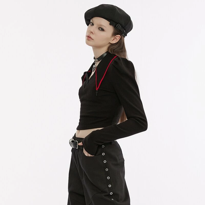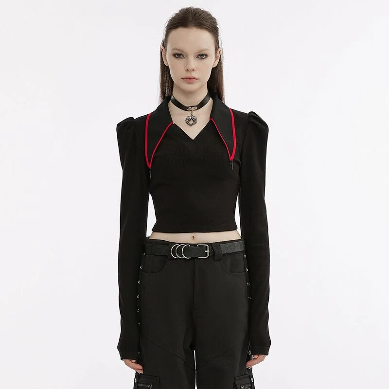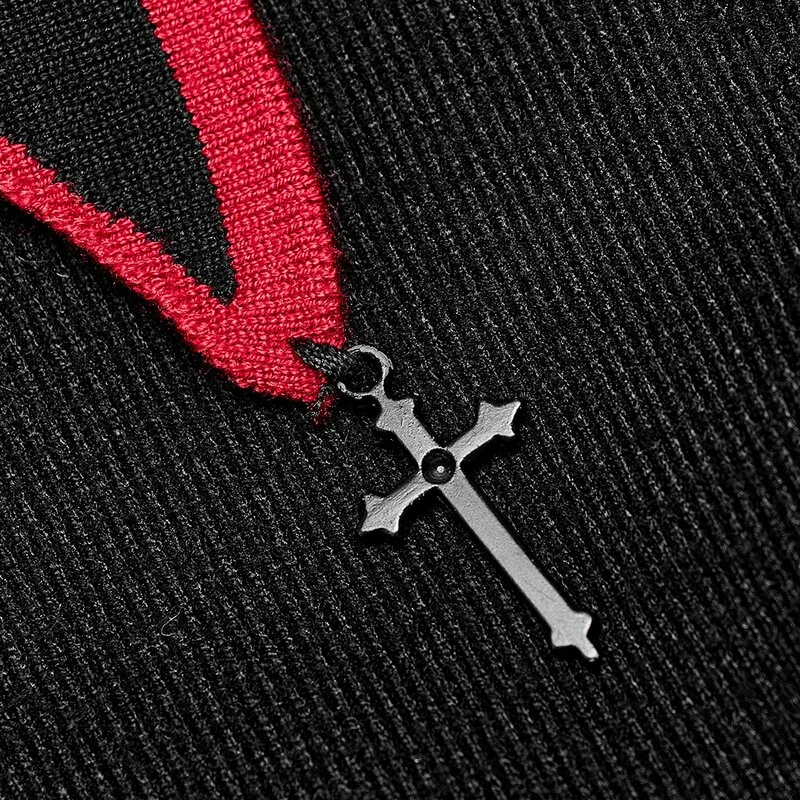 Punk Raves Sermon Oberteil ist aus einem superweichen Viskosemischgewebe. Es ist kurz geschnitten und hat einen V-Hals Ausschnitt mit extra lang und spitzem Kragen. Der Kragen hat einen roten Rand und zwei kleine Kruzifixanhänger.