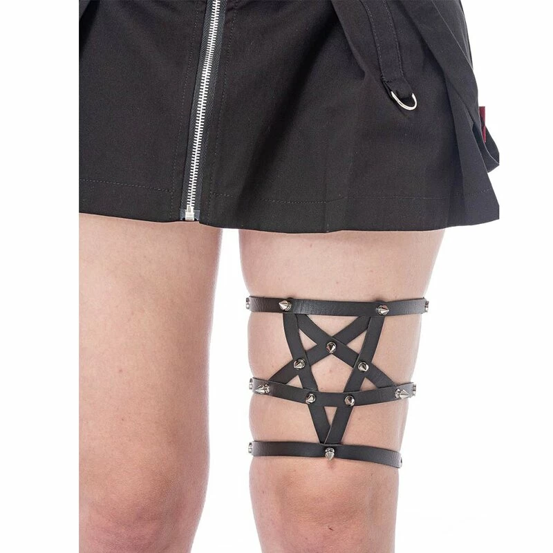 Queen of Darkness‘ Pentagram Beinholster ist ein Strumpfband in der Form eines Pentagramms, welches mit Spikes verziert ist. Die Rückseite ist elastisch und größenverstellbar.